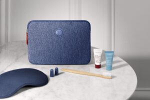 In the Business cabin, there are two models of the kit available, with motifs featuring the airline’s signature colours in different shades of navy blue and white, with a touch of red. It also features the company’s winged seahorse and is made from over 90% recycled material. Particular attention has also been paid to its contents: