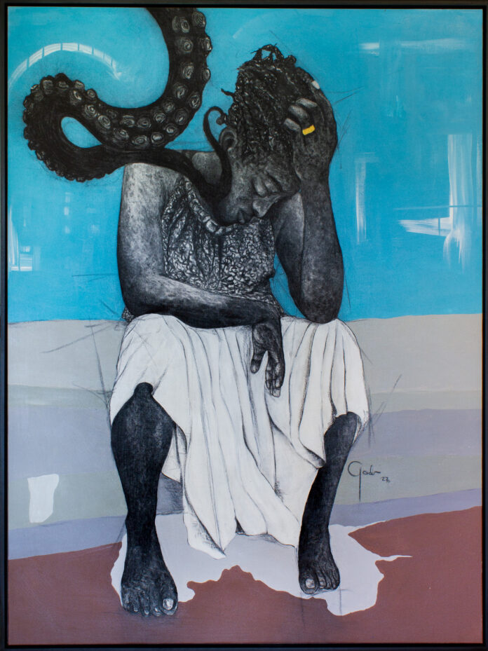 As a metaphor, it addresses leadership, family dynamics, and Africa’s broader struggles. The colours—blue, grey, and brown—symbolize land, sky, and global context, while charcoal evokes Tanzania’s cultural essence and the Black African experience. Titled If I Knew (Laiti Ningejua), it explores post-decision doubts. The octopus, symbolizing the male figure, represents the unfulfilled social contract, highlighting the complexities of negotiation and disillusionment.