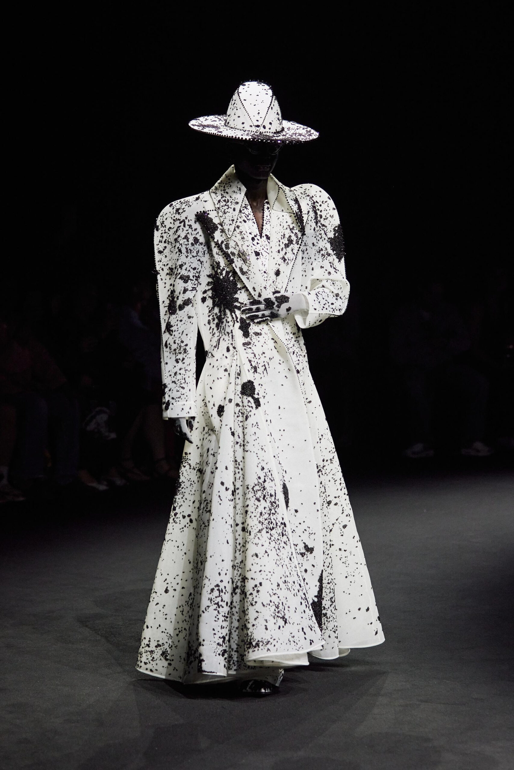 densely embroidered with black crystals. Another features blue-toned crystals that